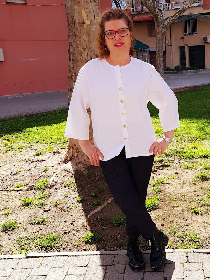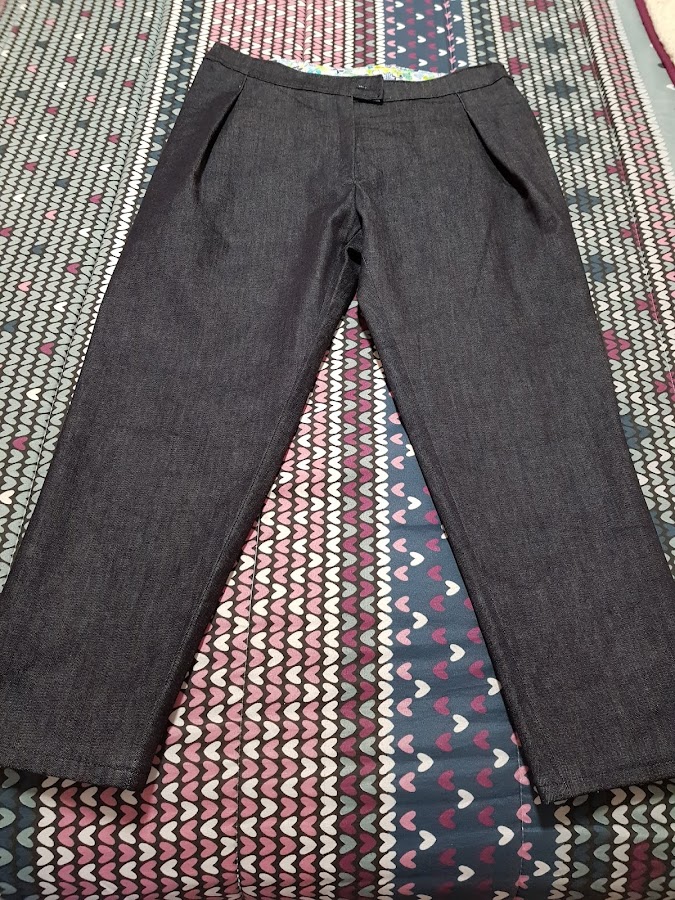 El patrón de los pantalones es sencillito lleva unos pliegues en forma de pala en delantero y pinzas en la parte trasera , el corte es mas bien estrechito y el largo del pantalones es tobillero ya pensando en el buen tiempo .