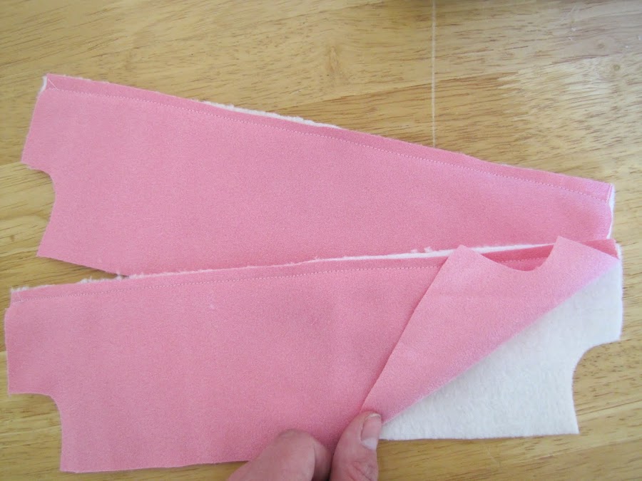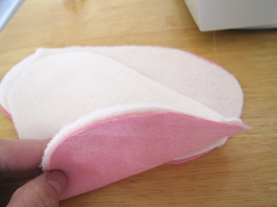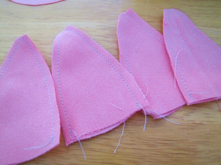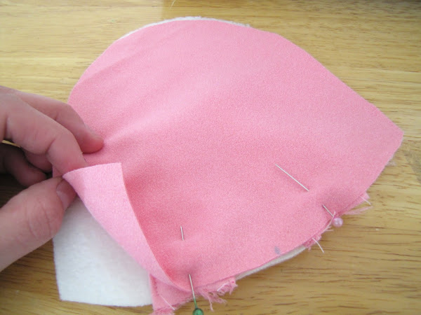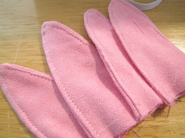 Vamos a hacer las orejas. Derecho con derecho cosen entre sí mediante una costura de 1/4 de pulgada permitir. Espero que recuerdes para hacer su pieza del patrón más grande o el oído será flaca y pequeña! . Sujete el punto en la parte superior y girar al derecho.
