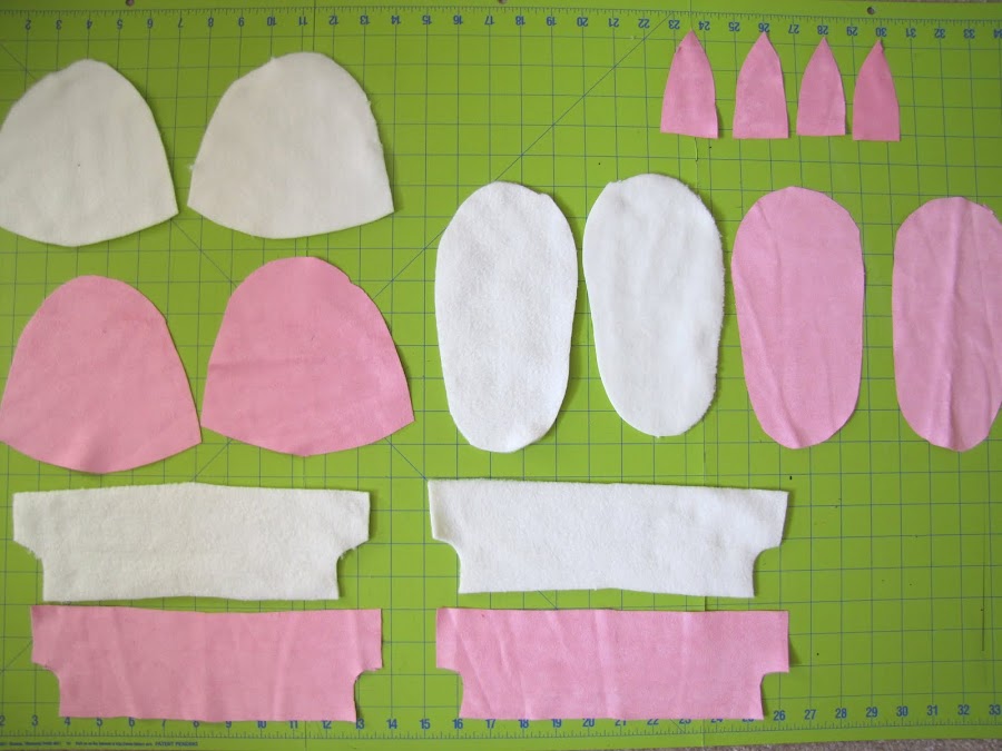 . Uso de las piezas del patrón en el archivo PDF cortar como se describe. Usted debe tener lo que usted ve arriba, excepto que usted debe tener 8 orejas de conejo de la trama principal, no 4. Además, se me olvidó añadir margen de costura a la pieza del oído del conejito para cortar alrededor de 1/4 de pulgada más grande en todos los lados de la pieza es.