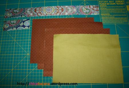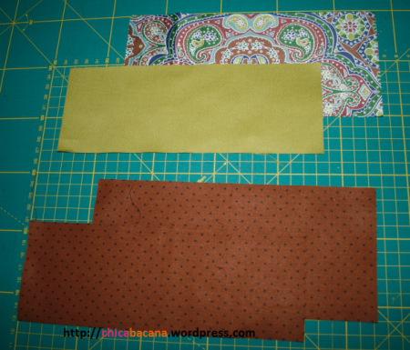 Corte 3 retângulos de 16 cm X 22 cm (forro interno e forro do bolso frontal);
