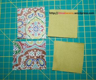 Corte dois quadradinhos de aproximadamente 4 cm X 4 cm – não precisa muita precisão, pois as sobras serão aparadas depois (para as extremidades do zíper).