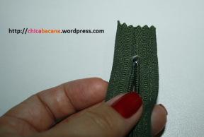 Abra o zíper menor até a metade. Na extremidade que fica aberta, dê uns pontinhos com a agulha, fechando-o. Isso facilitará a costura do quadradinho de tecido no zíper.