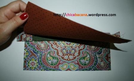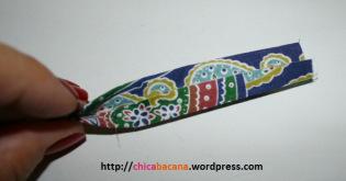 Marque com o ferro o meio duas faixas de tecido estampado (no sentido do comprimento). Dobre mais uma vez: agora a largura é de 1 cm.