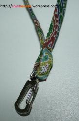 Passe uma das pontas da alça pela argola do mosquetão e costure as duas pontas superpostas fechando a alça. Faça mais uma costura unindo os dois lados, para que o mosquetão fique fixo.