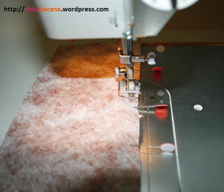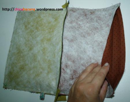 Acomode o forro por baixo e prenda as laterais com alfinetes. Isso facilitará a montagem do próximo “sanduiche”, evitando que os tecidos se desalinhem.