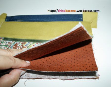 Agora faça um segundo “sanduiche” na seguinte sequência: embaixo o forro frontal superior com o lado direito voltado para cima, no meio a parte que já está presa ao zíper com o tecido estampado para cima e por último o tecido liso da parte superiorda bolsinha com o direito para baixo. A foto ajuda a entender melhor a sequência.