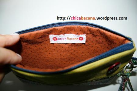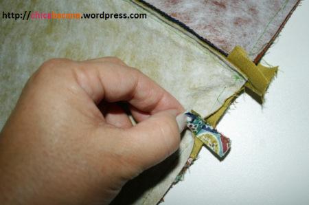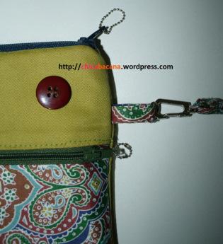Passe a argolinha pela alcinha menor e posicine ela entre frente e fundo da bolsa, uns 3 a 4 cm abaixo do zíper. A argolinha fica voltada para dentro e as pontinhas da alça para fora, como pode ser v isto na foto abaixo.