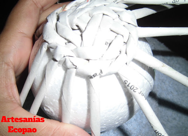Ahora vamos a forrar la bolita. Preparamos la base del tejido con 6 rollitos. Ubica primero 4 rollitos formando una x y sobre la misma 2 rollitos más de manera vertical.