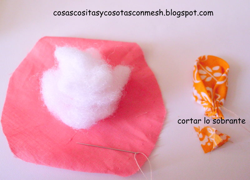 6.-Para hacer el centro de la flor solo forre una bolita de guata y cosí.