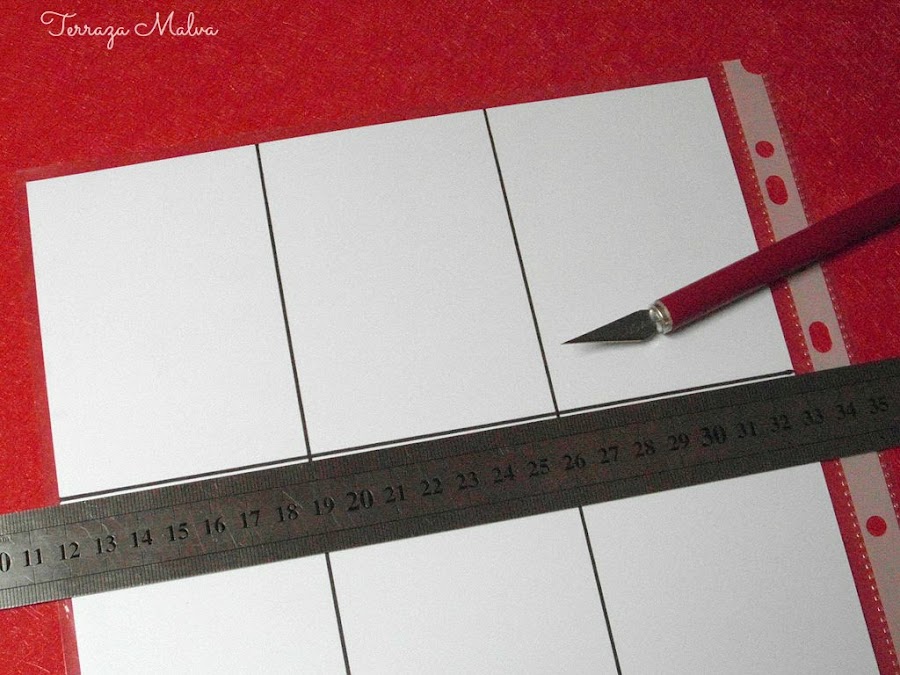 Hay que hacer una plantilla en cartulina gruesa o cartoncillo que nos servirá de guía y de mártir a la hora de cortar y sellar los bolsillos. Para mis Pocket Letter divido un A4 en tres filas y tres columnas iguales (de 7 cm de ancho y aproximadamente 9,9 cm de largo).