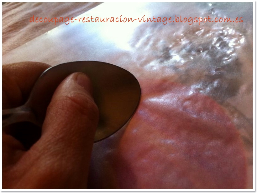 4- Cubrir con el plástico de un archivador transparente o algo similar y con una cuchara, aguantando el plástico para que no se mueva ( aquí no podía hacer las dos cosas a la vez porque tenía que hacer la foto ) frotar fuerte toda la superfície de la imagen. Veremos a través del plástico como la imagen se va viendo más floja cuando la frotamos porque la tinta ya va pasando a la tela. Es super importante hacer esto a conciencia, donde no frotemos no habrá transfer.