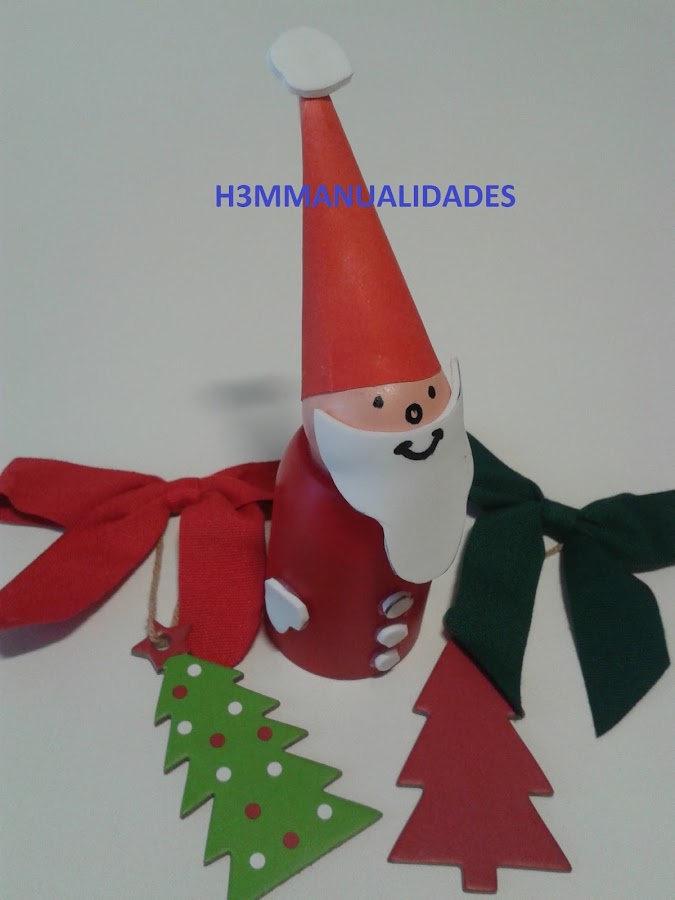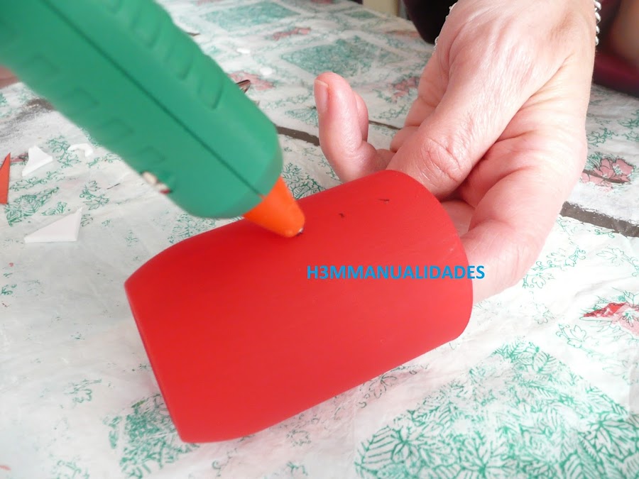 Colocamos también la bola del desodorante pintada sobre la base del cuerpo (también con la pistola de silicona), y vamos recortando en una cartulina roja lo que hará el cucurucho que será el gorro.