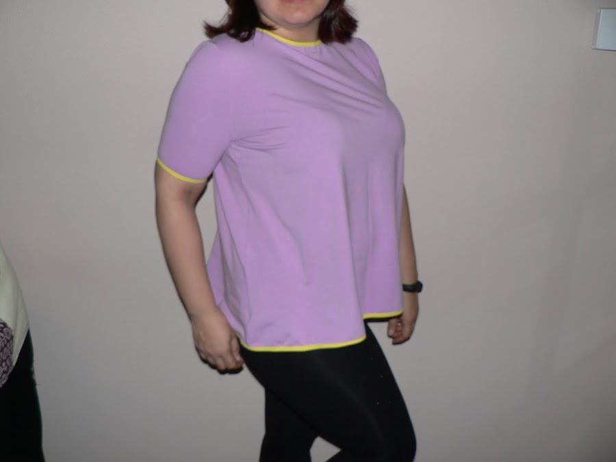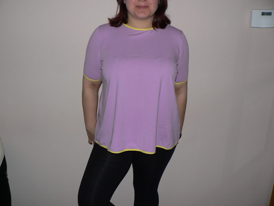 Es una camiseta sencilla, con cuello cerrado, y el original es de manga tres cuartos, aunque yo la he hecho de manga corta porque no me daba la tela para más, y camisetas de manga corta también me hacían falta.