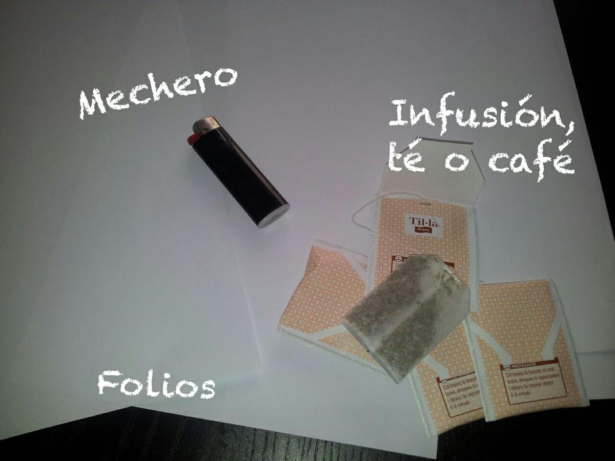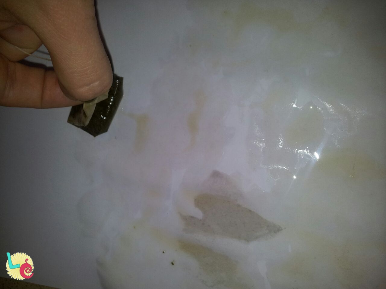 No hay más que pasar la bolsa de infusión/té o el café por toda la superficie húmeda del papel, por ambas caras para que el papel quede teñido por completo.