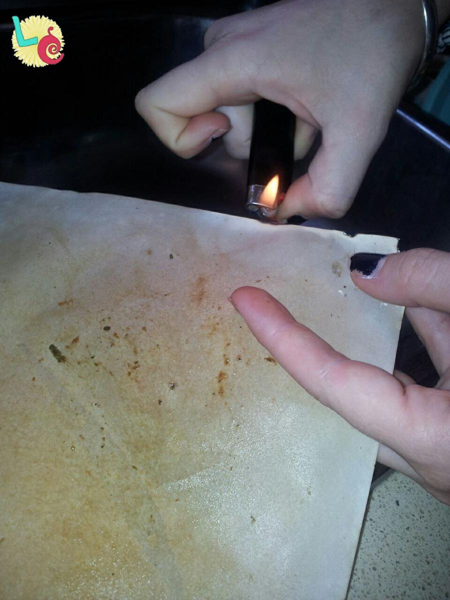 Una vez seco, comenzamos a quemar los bordes, no hace falta más que un mechero y un poco de cuidadito si el papel está un poquito húmedo aún, será mejor, porque así no prende y no nos quedaremos sin papel.