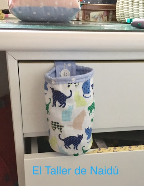 La mía al final quedó así. Las telas son las mismas que las de la funda de la máquina de coser. No seguí un tutorial concreto, sino que adapté los que tenía a mis necesidades. No tengo mucho espacio para ponerla, así que va colgada en un cajón (por dentro lleva velcro y cinta de doble cara) y tiene la altura justa para poder abrir el cajón de abajo con comodidad.