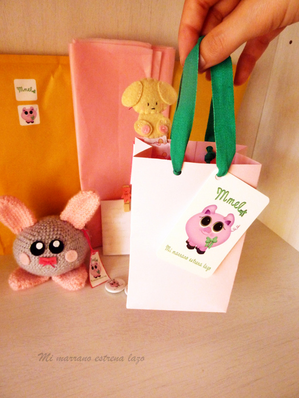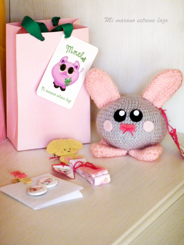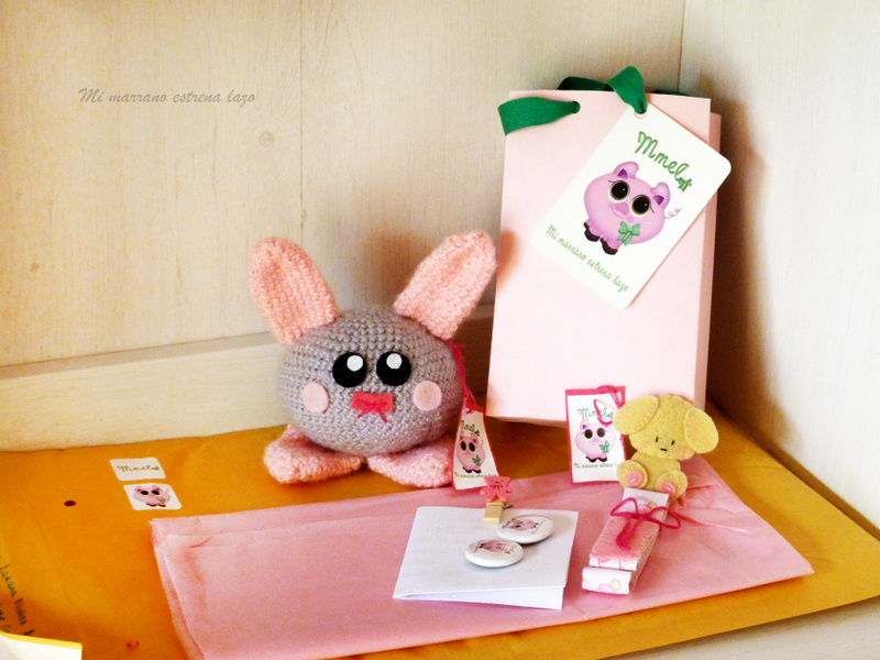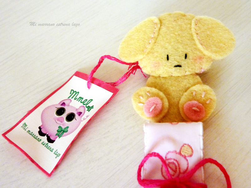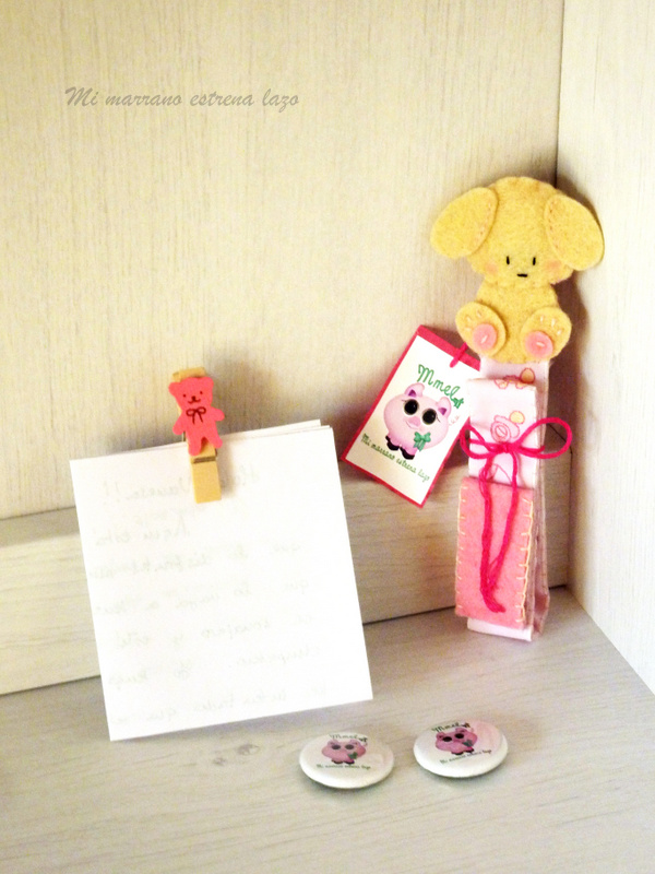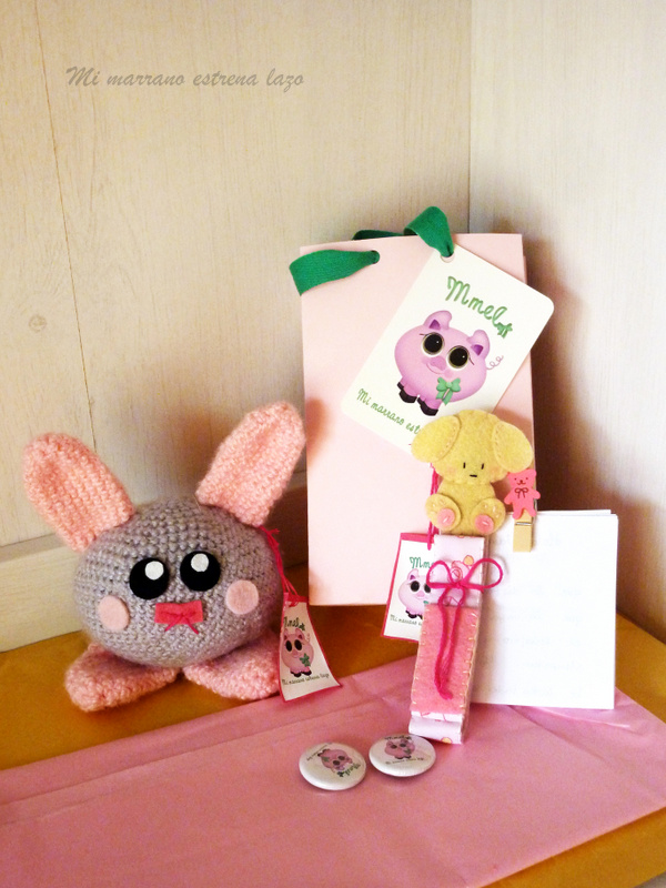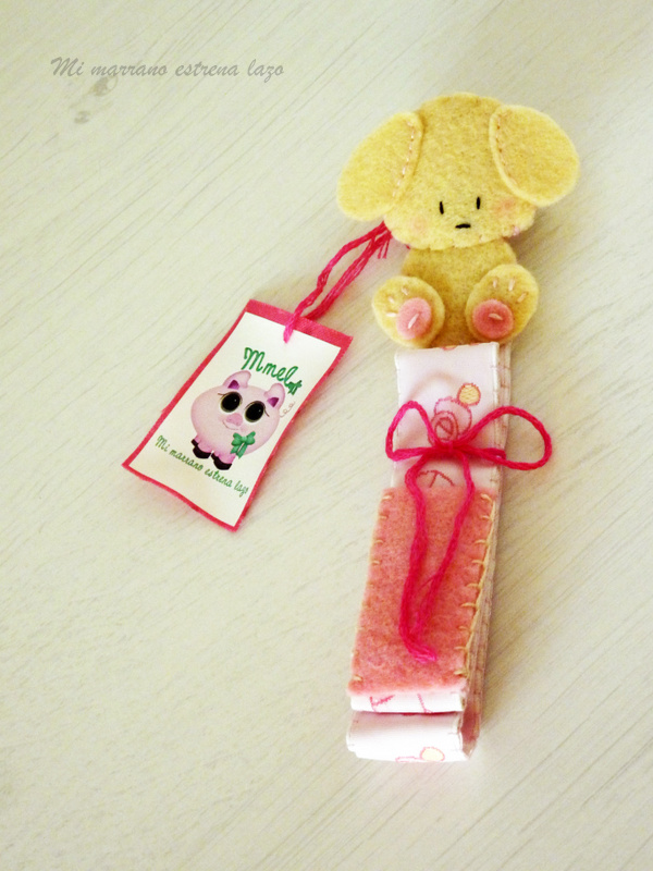Y aquí está el resultado!! os dejo las fotos del sonajero, del chupetero, con las correspondieres etiquetas de Mi marrano estrena lazo, y de las cositas que van dentro del paquete, una nota cerrada con una pinza de osito, dos chapas de Mmel, una para la peque y otra para su mami, todo dentro de una bolsa con asas de lazo verde y papel de seda rosa.