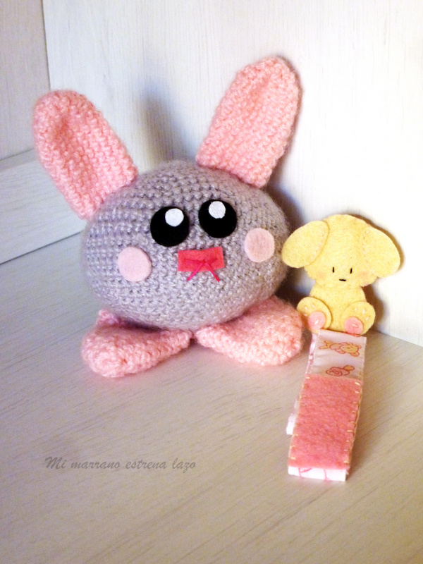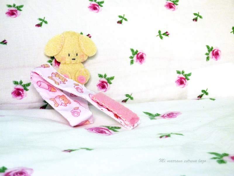 Un pedido muy bonito, para una niña chiquita. Su mamá me pidió un sonajero, un conejito, y se dejo aconsejar en los colores, rosa y gris. También me pidió un chupetero, rosa, pero tenía que ser algo especial, uno de los miembros de la familia es perruno, y quería que fuera un homenaje a esta mascota tan simpática.