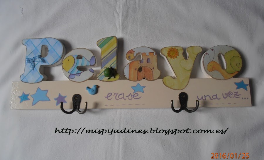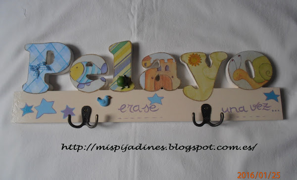 Perchero para Pelayo, con decoupage en cada letra y lo demás pintado a mano..
