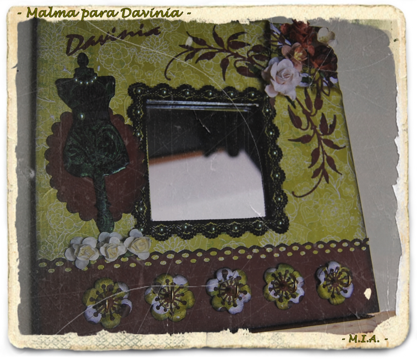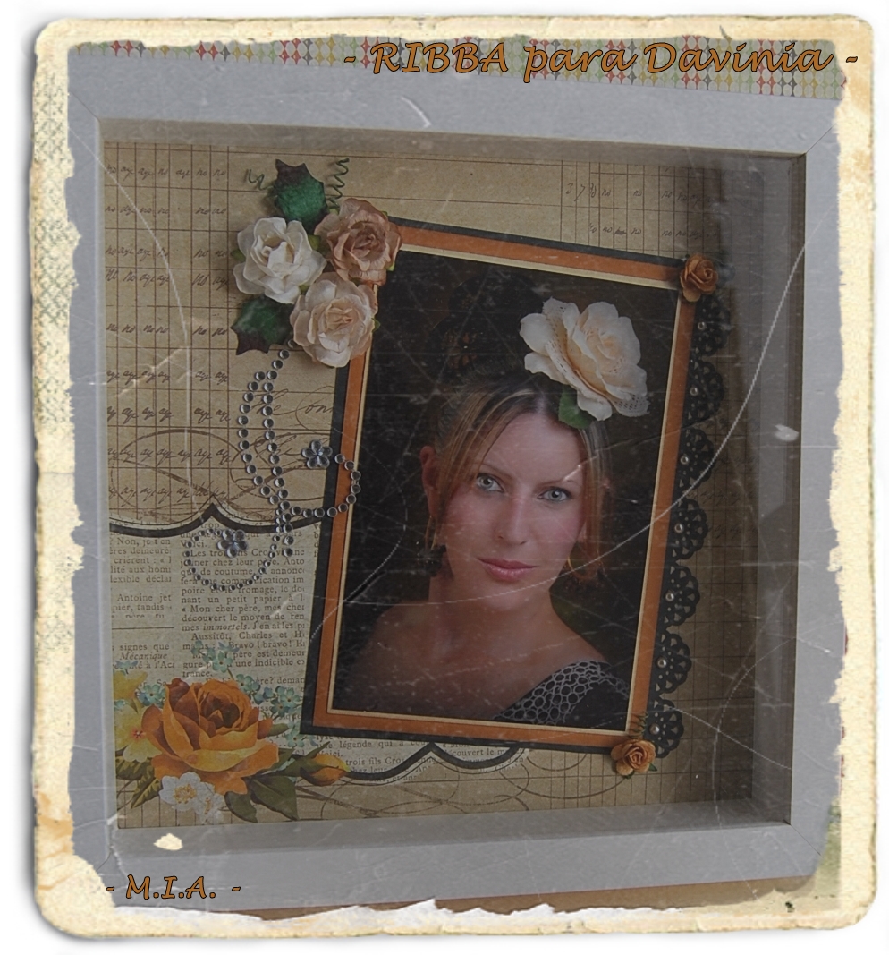 Como complemento un RIBBA con papeles My Mind"s Eye para enmarcar una preciosa foto que monté sobre varios tonos de cartulina en contraste. Con flores de tela adorné las esquinas, un arabesco de brillantes y poco más... que no quería eclipsar la foto con mucho adorno.