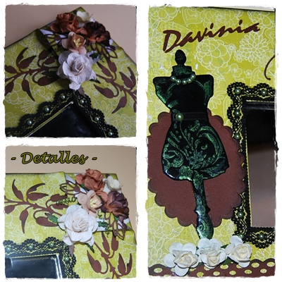 A la izquierda puse un maniquí que hice con la ayuda de Ruth en mi viaje a Tenerife, embosado con varias capas de UTTE negro y al finaL estampando un sello con tinta metalizada en verde. Este maniquí va montado sobre un scalop ovalado marrón. Algunas perlitas, encajes y mini rosas blancas completan el trabajo.