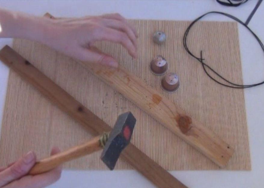Con ayuda del martillo comenzaremos a aplanar las cápsulas, pero solo un poco. Cuando estén un poco aplastadas, las uniremos intentando que se unan por los pliegues haciendo que encajen las dos haciendo presión con los dedos. Luego las ponemos entre las dos tablitas de madera y aplastamos con el martillo. Si este paso te resulta demasiado complicado, aplasta las cápsulas y las unes con pegamento. un nudo.