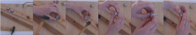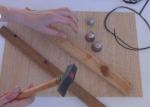 Con ayuda del martillo comenzaremos a aplanar las cápsulas, pero solo un poco. Cuando estén un poco aplastadas, las uniremos intentando que se unan por los pliegues haciendo que encajen las dos haciendo presión con los dedos. Luego las ponemos entre las dos tablitas de madera y aplastamos con el martillo. Si este paso te resulta demasiado complicado, aplasta las cápsulas y las unes con pegamento. un nudo.