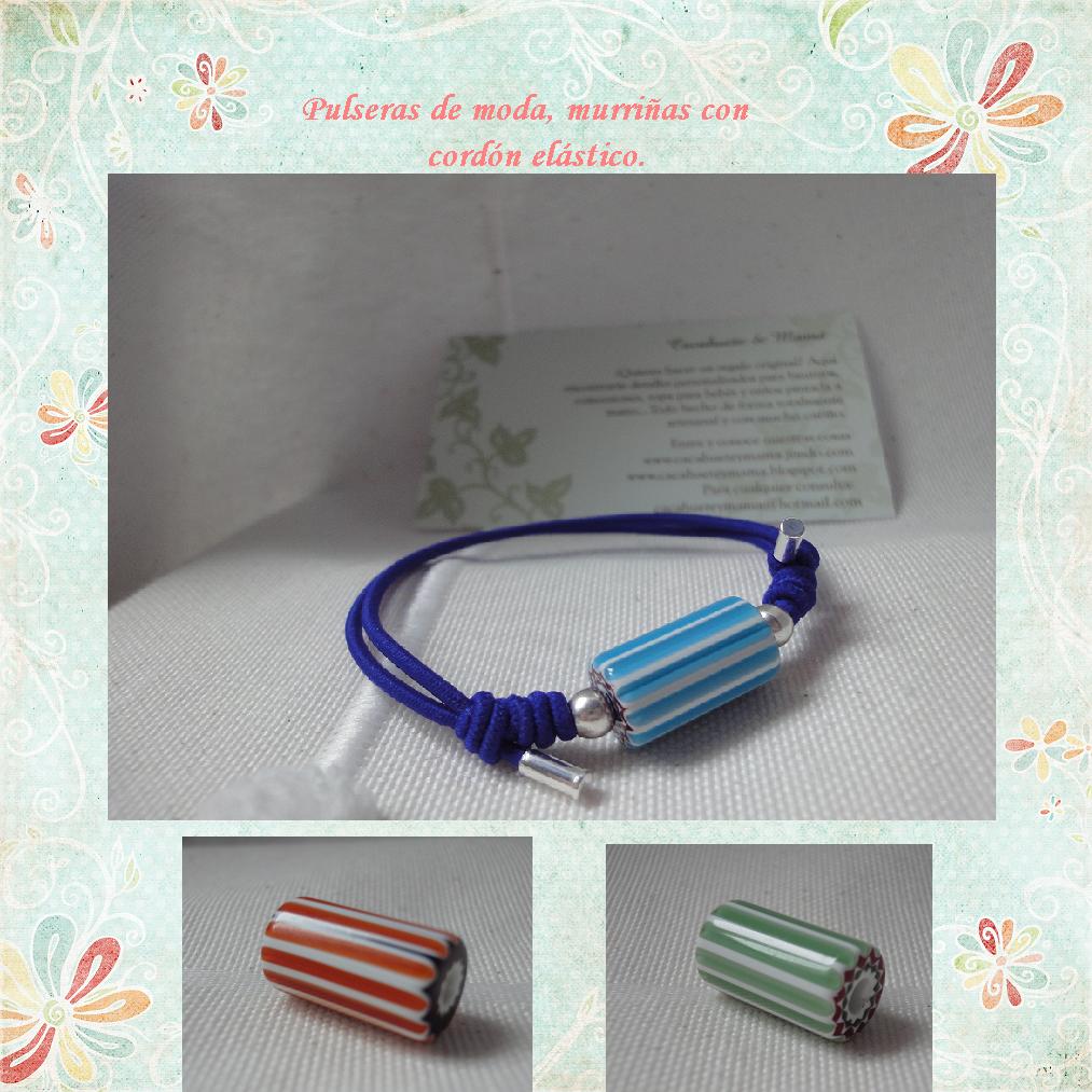 Nuevas pulseras de cordón elástico, mucho más fáciles de moner y quitar, mucho más comodas y sobre todo, mas seguras, ya que no tienen cierre. Esta es una de las primeras que he hecho, lleva murriña de cristal a rayas, color celeste y blanco, bolas de plata de 3mm y terminales de plata, para que no se desate nunca el nudo corredizo. Hay varios colores, tanto de murriñas como de cordones, podeis preguntarme al mail. Quedan genial para llevar varias juntas.