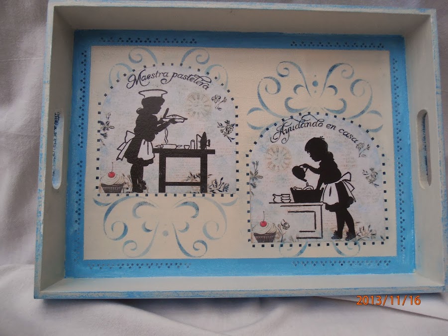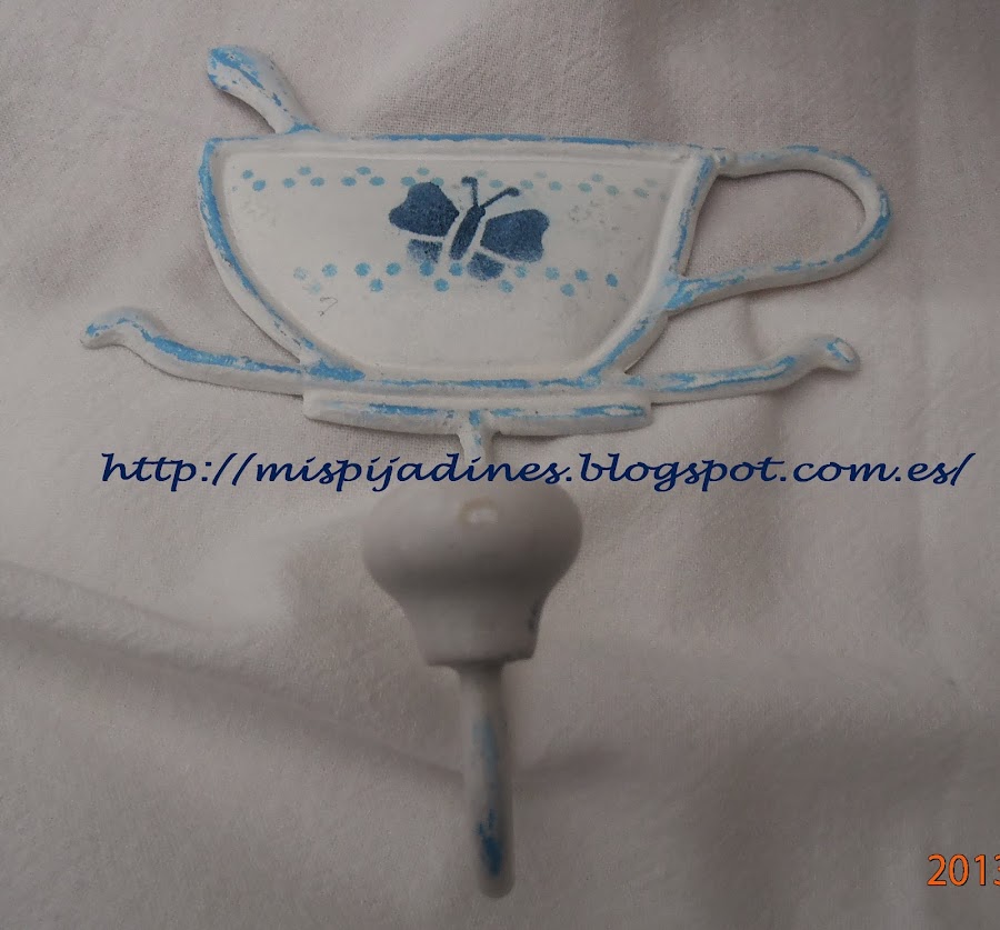el reloj : he cortado yo la madera con la sierra de calar y le di la forma en la parte de arriba... con el oportuno lijado de los bordes , a continuación le di dos manos de imprimación , y puse estuco en todo el borde del reloj...le di una mano de color azul, utilice la técnica de la vela y le di una mano de color tapioca, lije para sacar el azul , hice el decoupage ..y ya seco todo le hice los stencil en azul...al igual que el reloj fui haciendo todos los soportes a la vez para que quedasen lo mas parejos posible...