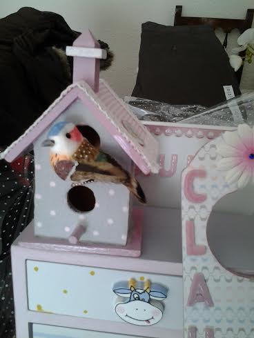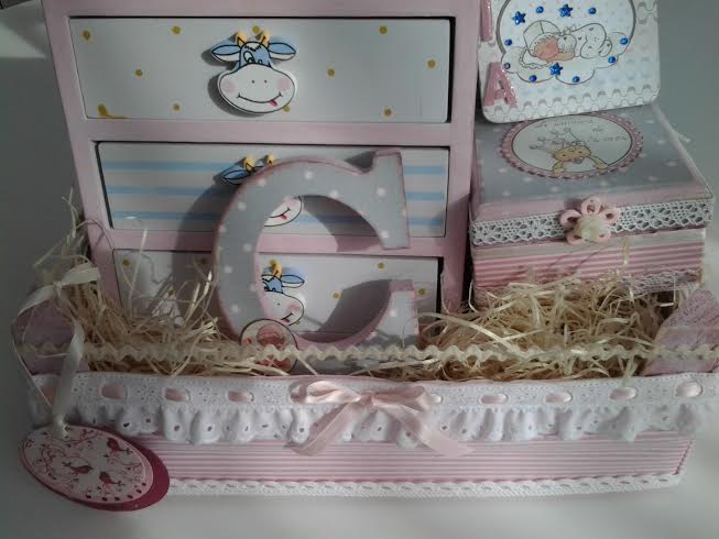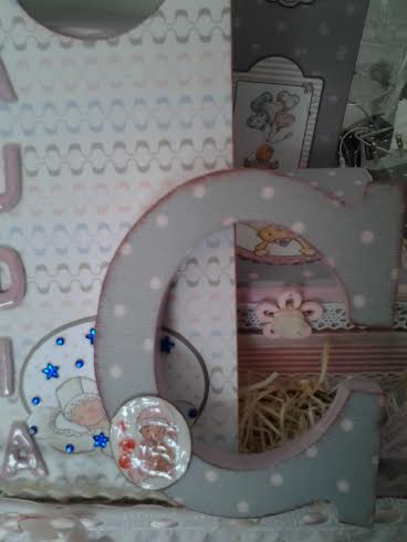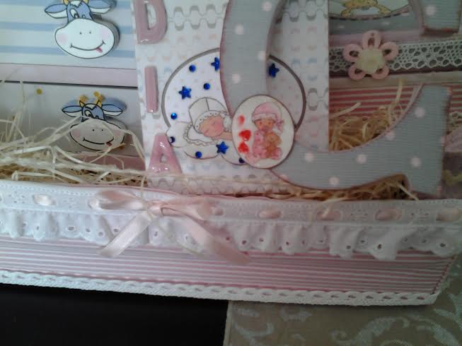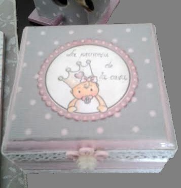 La caja que los contiene es una caja de mandarinas forrada con tela por dentro y por fuera. Falta también una perchita decorada en decoupage en tonos a juego con el conjunto, pero se quedó fuera de la fotos porque ya estaba puesta en su sitio.