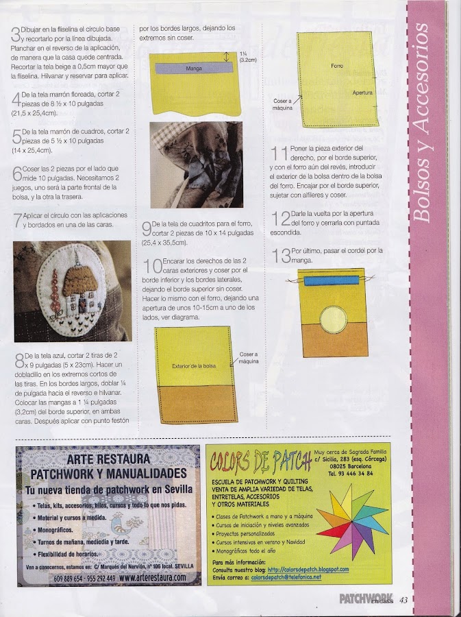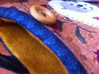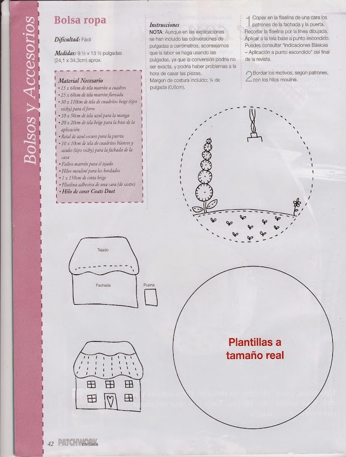 Les cuento que la idea la tomé de una revista Patchwork en Casa y la autora es Lynette Anderson y aunque originalmente el proyecto es un bolso (como verán en las imágenes que a continuación les dejo por si quieren ocupar el molde) me pareció que quedaría muy bien para la funda de mi tablet, traté de replicar lo más posible los colores de las telas y finalmente para los detalles finales hice un poco de acolchado, hice en la tirita por donde pasa el botón mi primer ojal hecho a máquina y por último el forro lo hice con fieltro que aunque no me agrada mucho como luce después de algunas lavadas creo que es lo mejor para evitar los rayones :P
