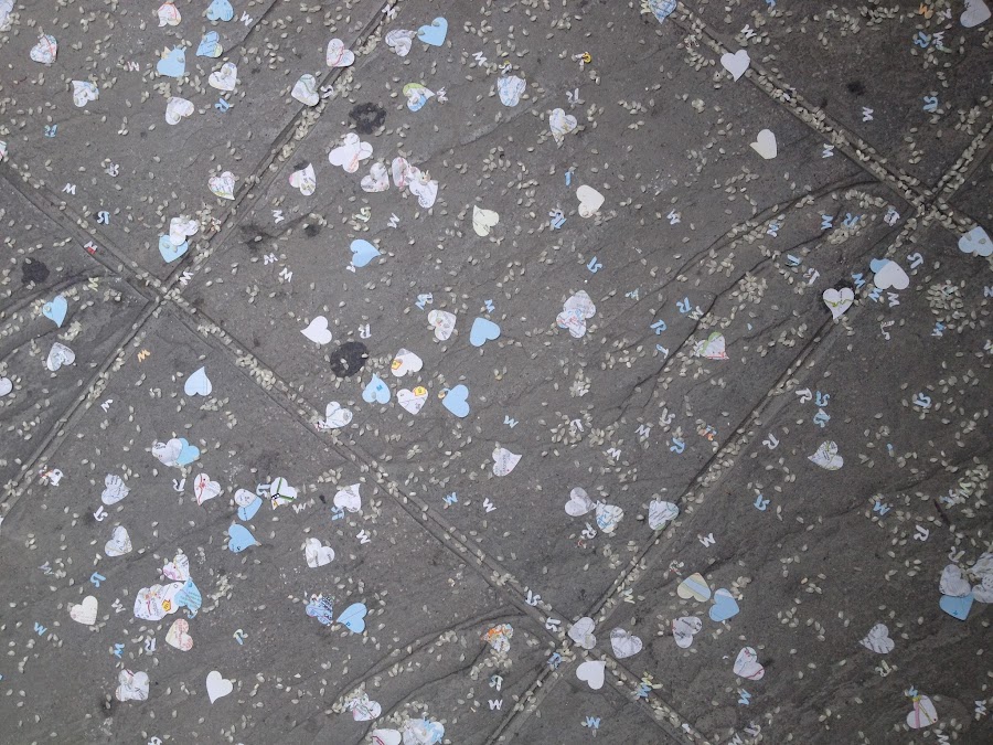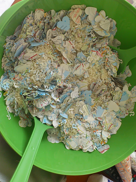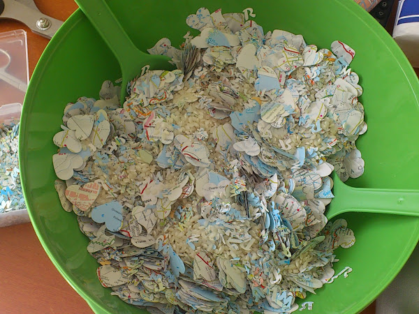 Y ya para terminar, lo he utilizado para hacer Confetti con diferentes formas para la boda de mi sobrina. Como son muy viajeros, además del tradicional arroz, le hemos tirado también confeti con forma de corazón y también he troquelado sus iniciales. Esto lo podéis ver con más detalle aquí.