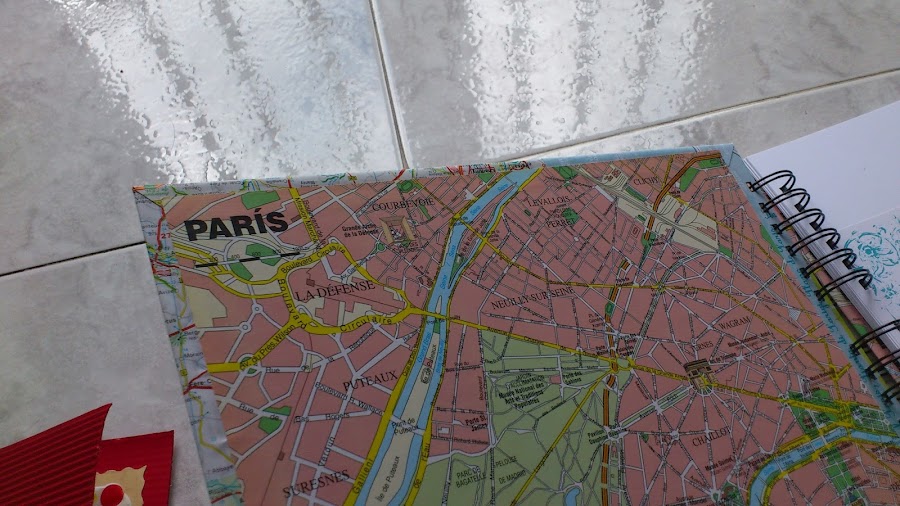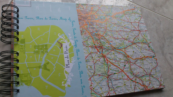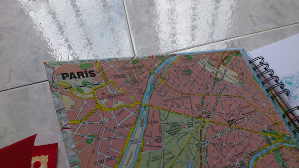 El Atlas era también un plano de carreteras, y con éstas, centrando en la ciudad que me interesaba, las he utilizado para forrar las portadas de los álbumes para guardar los recuerdos de cada sitio. Este, por ejemplo de París,
