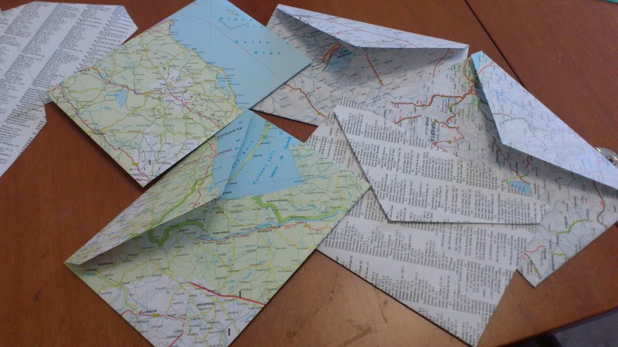 Luego, con las hojas de detrás, donde viene el índice de lugares lo utilicé para hacer sobres para las tarjetas de felicitación.
