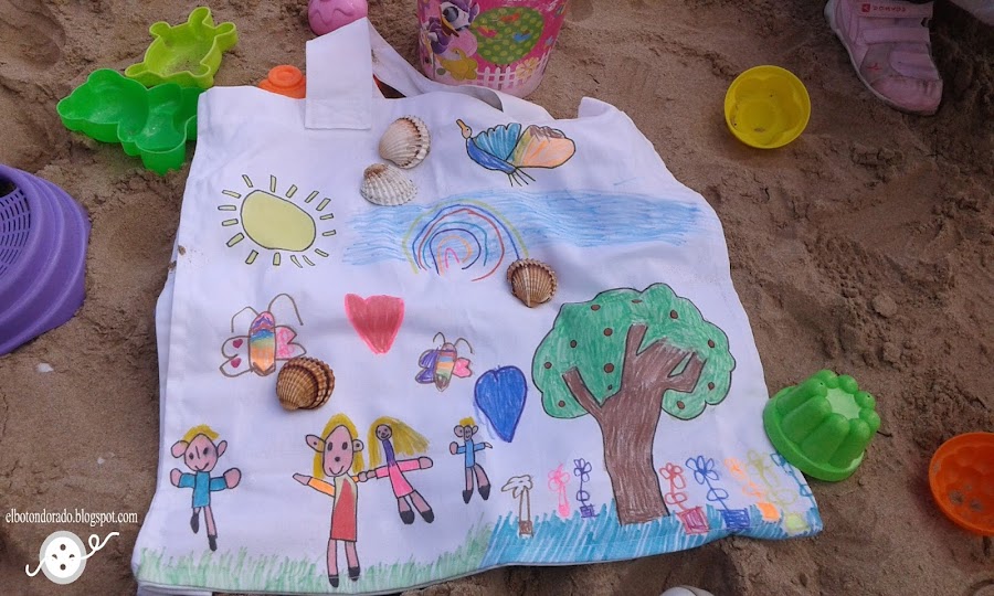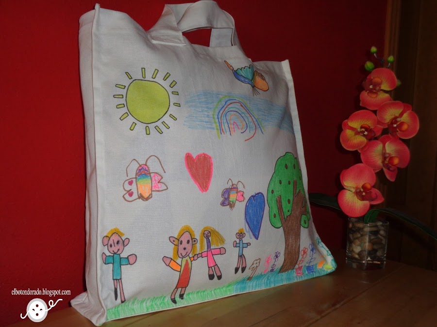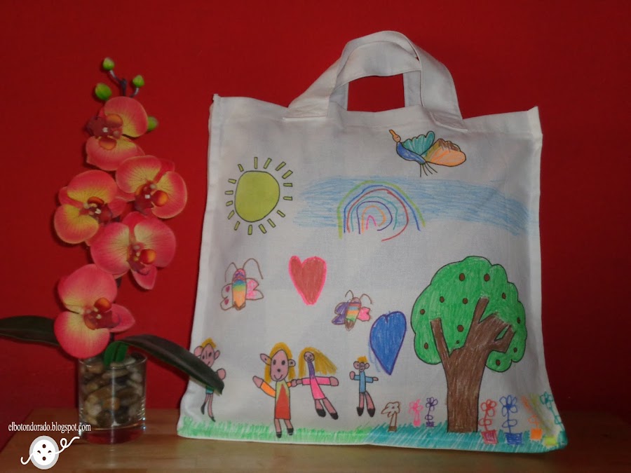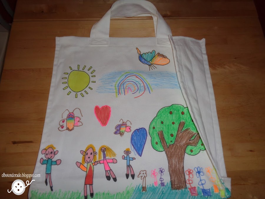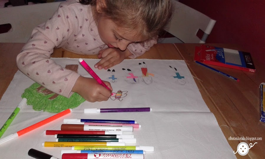 En fin, que este año cuando escuchó por la radio que iba a ser el día de la madre, me decía que me quería regalar algo, y una tarde que la vi aburrida aproveché y le pregunté que si quería hacer un dibujo en una tela. Como le encanta dibujar ¡¡ni se lo pensó!!