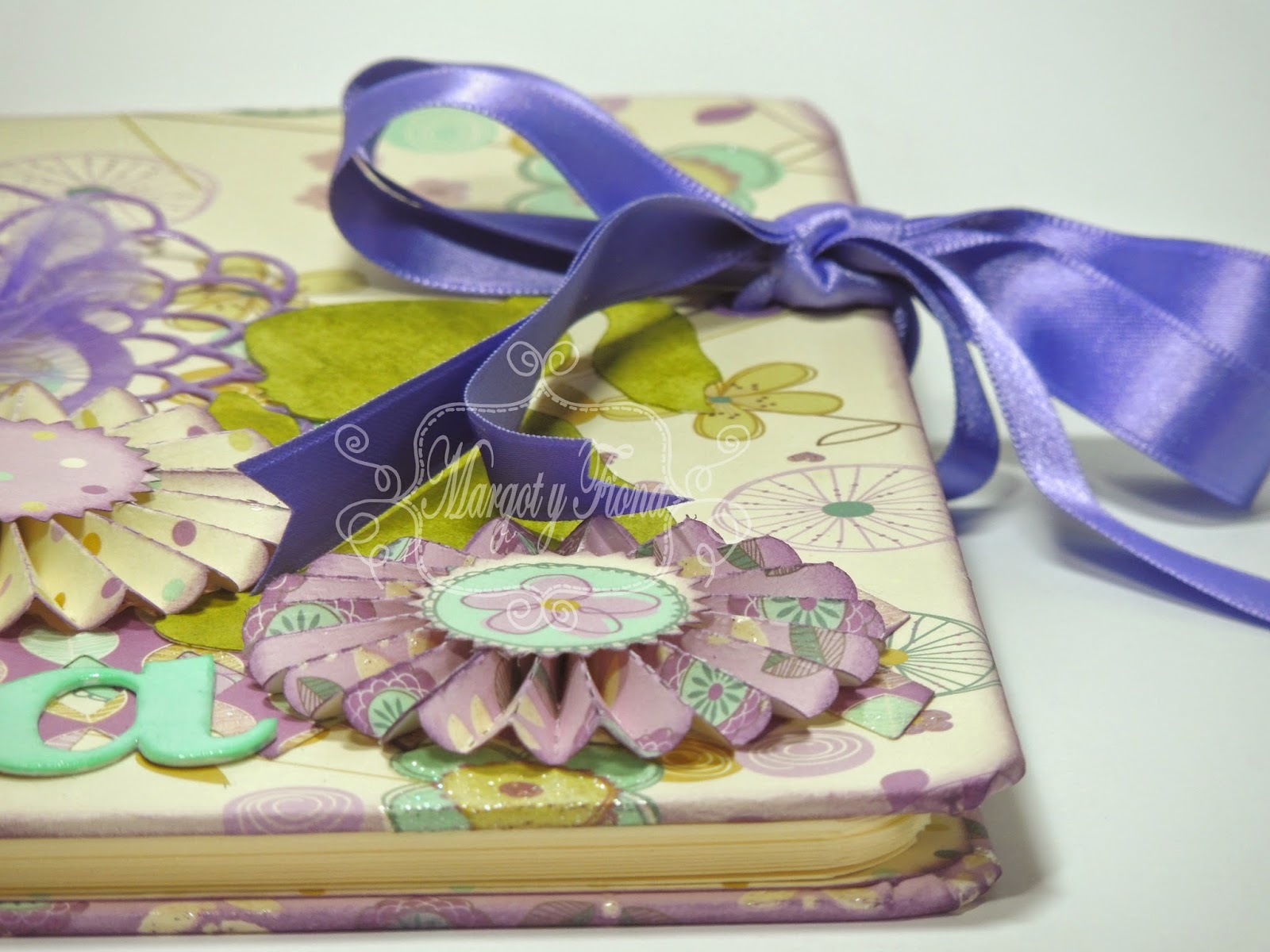 Para la encuadernación, en esta ocasión se usó espiral en blanco con lacitos a tono. Cubiertas redondeadas, y cierre mediante lazada.
