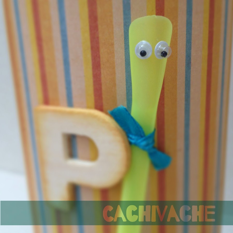 Para su transformación: muy sencillo, he utilizado el envase a tunear, papel scrap, unas tijeras, pegamento de doble cara, silicona caliente, una letra de madera, un trocito de cinta, unos ojos móviles y una pajita.