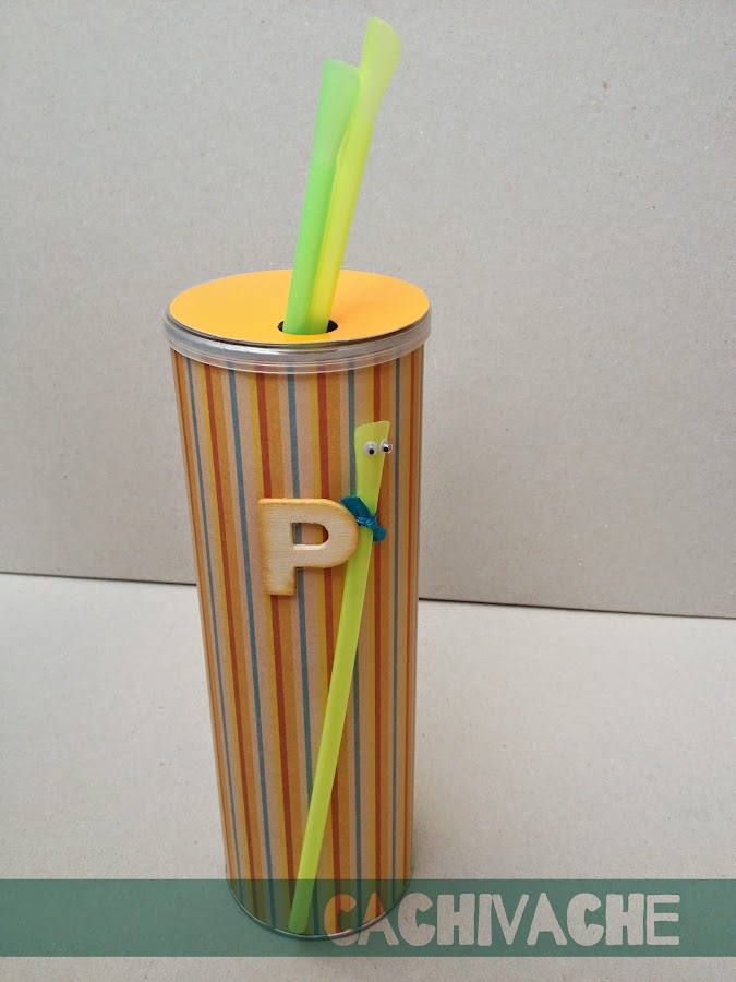 Con la cinta de doble cara pegar el papel al envase, en la tapa realizar un agujero y pegar papel. La decoración muy sencilla, pero graciosa: ya que como el peque de la casa esta aprendiendo las letras, le he colocado la P de pajitas y he creado a Don pajita pegándole dos ojos y una pajarita.