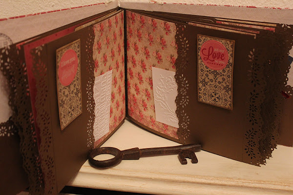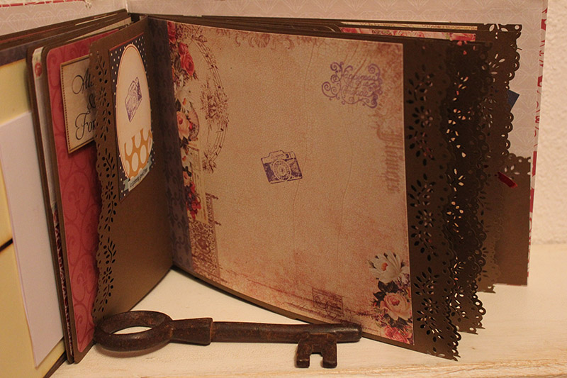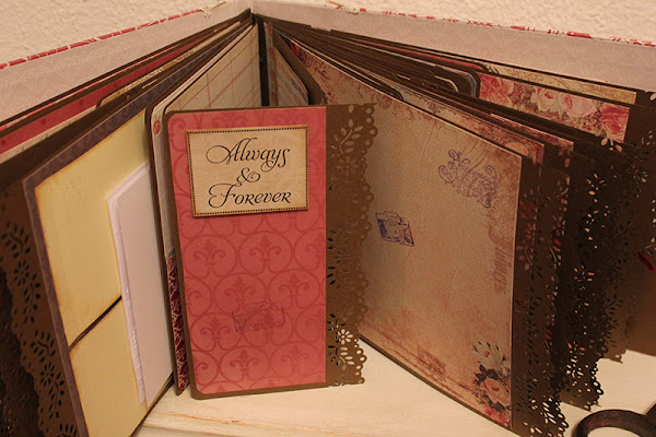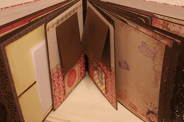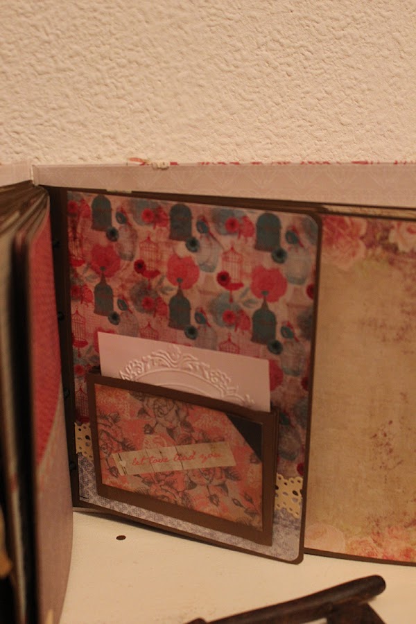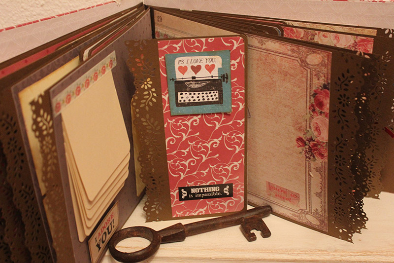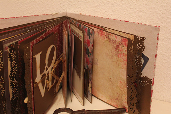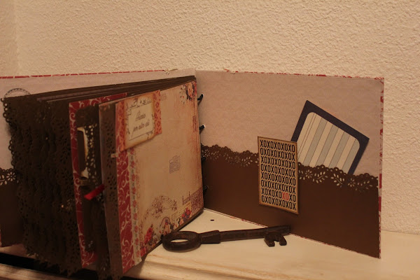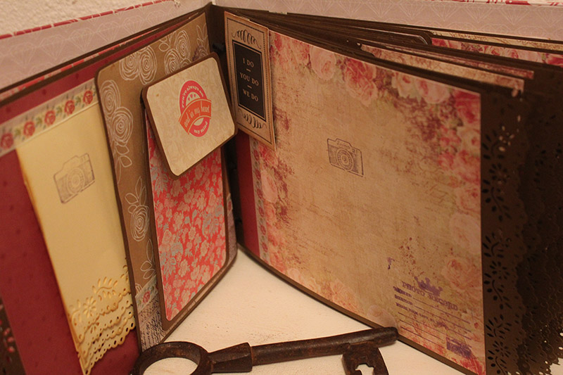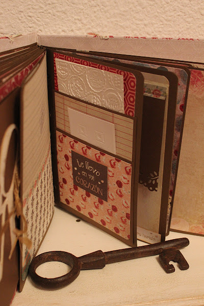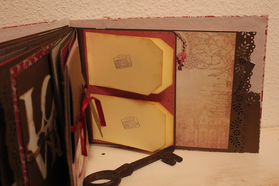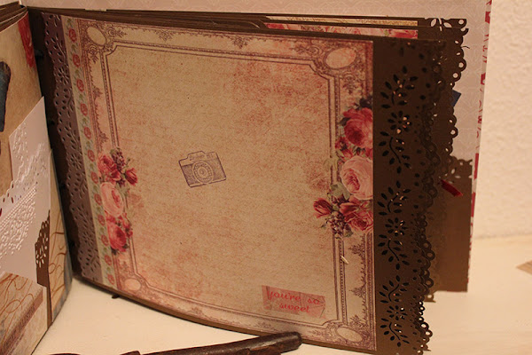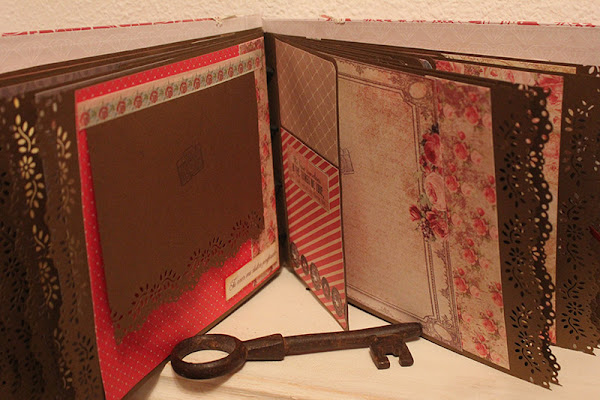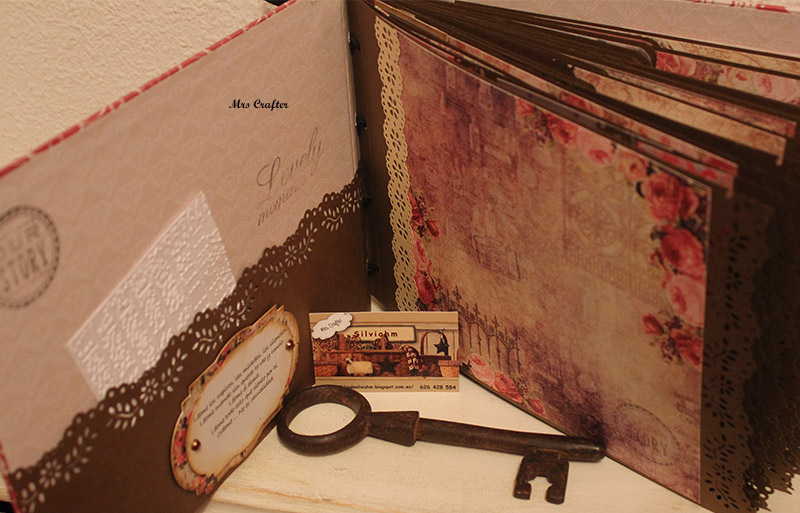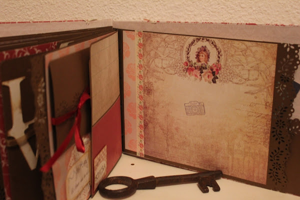 Como muchas otras veces, la encuadernación favorita de mucha gente: Encuadernación japonesa, con 20 hojas tamaño folio, todas ellas troqueladas en los bordes imitando puntilla, distintas medidas, mucho desplegable, mucho bolsillo, alguno con imán, tarjetas con textura donde colocar más fotos, alguna frase....todo ello listo para dar cabida a más de 100 fotos. Además, caja libro a juego, con los mismos papeles, divinos!!!!., y detalles en madera, todo ello muy, muy vintage.