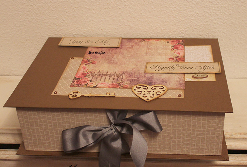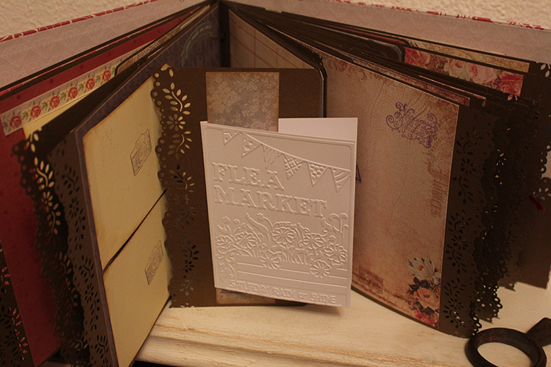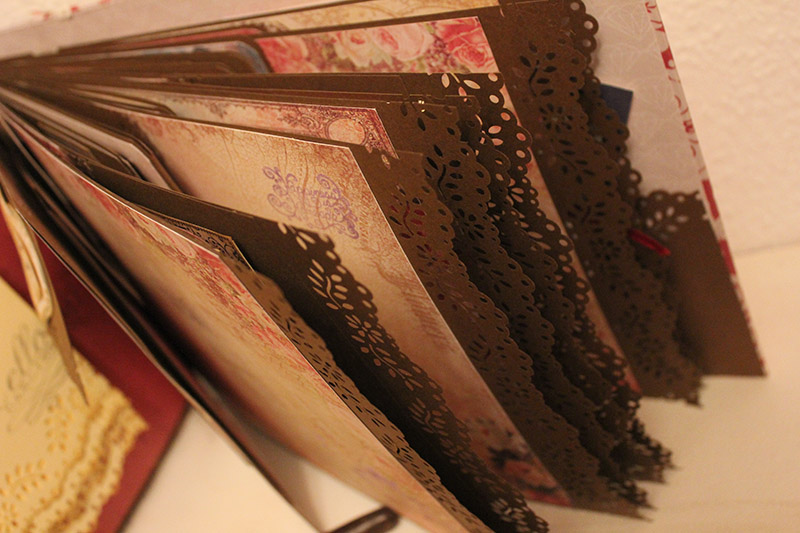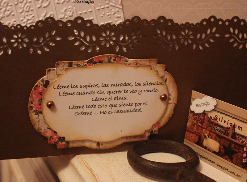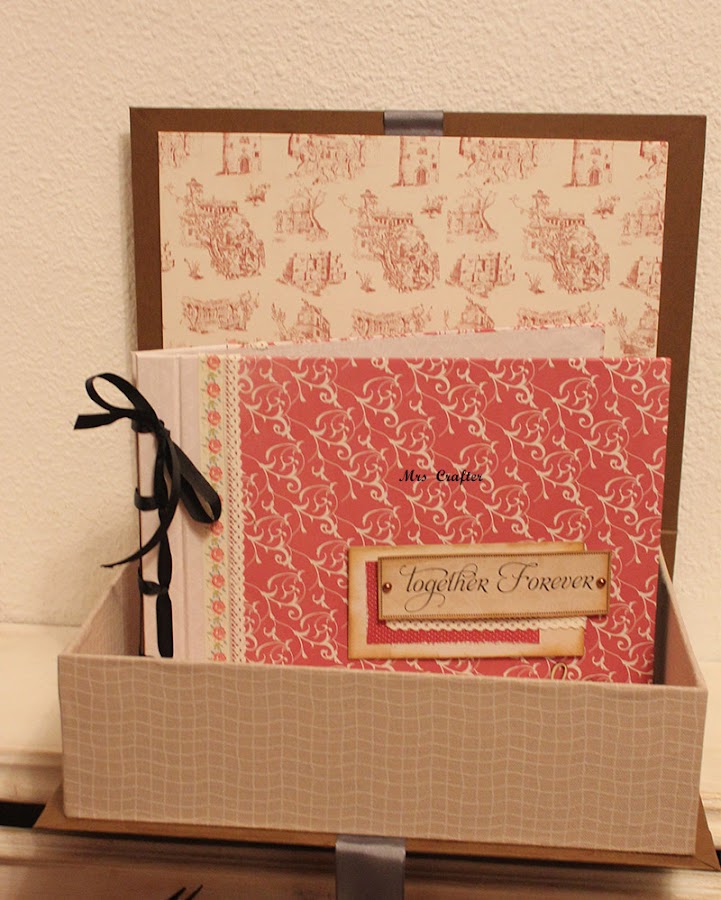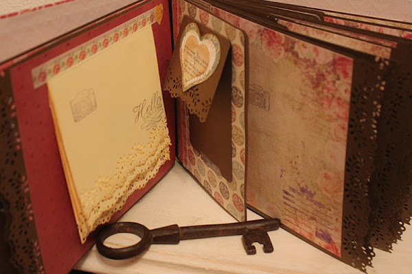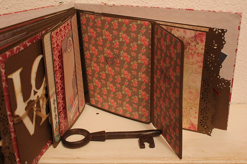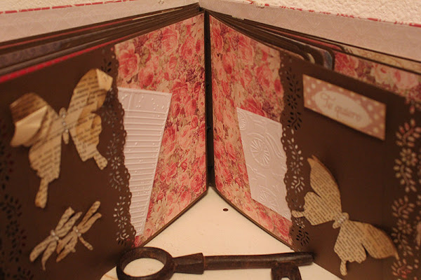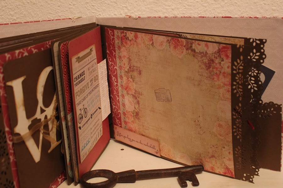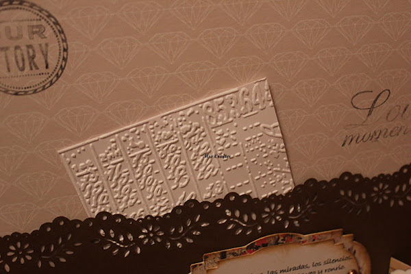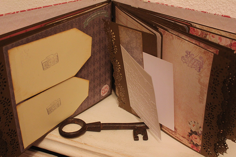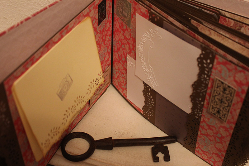 Como muchas otras veces, la encuadernación favorita de mucha gente: Encuadernación japonesa, con 20 hojas tamaño folio, todas ellas troqueladas en los bordes imitando puntilla, distintas medidas, mucho desplegable, mucho bolsillo, alguno con imán, tarjetas con textura donde colocar más fotos, alguna frase....todo ello listo para dar cabida a más de 100 fotos. Además, caja libro a juego, con los mismos papeles, divinos!!!!., y detalles en madera, todo ello muy, muy vintage.