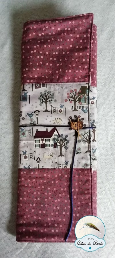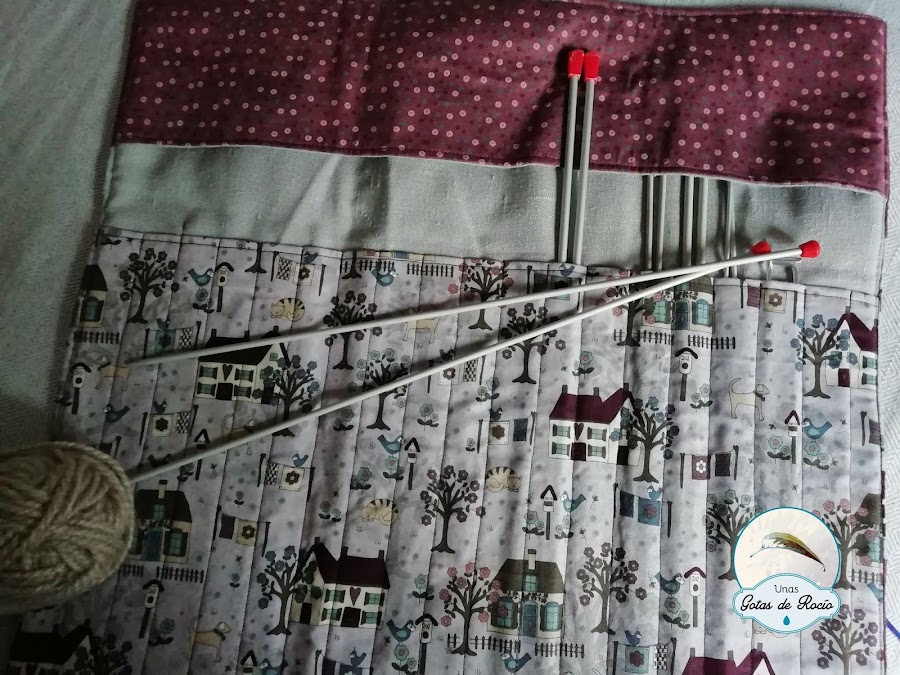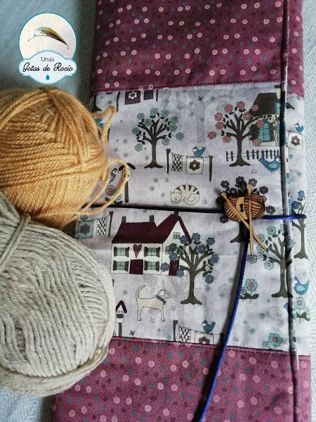 Y esa sensación tuve cuando vi esta tela de Lynette Anderson. El estampado reproduce mi casa, mi perro, mis gatos, mi jardín y mi tendedero. Era imprescindible tenerla y hacer con ella algo muy personal. El destino elegido fue una funda para las agujas de punto que yo no uso, pero que sí usó mi madre. No me gusta tenerlas recogidas de cualquier modo, y esta tela junto a otra de la misma colección, son una combinación perfecta para exponer en mi cuarto de costura.