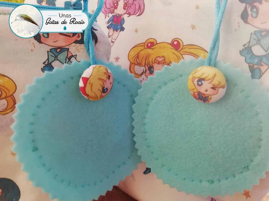 Cynthia y su amiga Magui vieron de pequeñas los dibujos de Sailor Moon, por eso esta tela con sus personajes les hace especial ilusión. Sus nombres van en pequeño tamaño del tirador de la cremallera, y por detrás les he añadido un botón forrado con la misma tela.