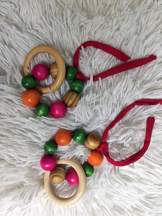 Además quise hacerles unos bonitos sonajeros, llamativos, para que llamen la atención del bebe, de madera, un material noble, con diferentes texturas y tamaños, unas bolas de madera en distintos tamaños, con colores llamativos y una arandela de madera, serán suficientes para llamar su atención y sonar al moverse, así les gustara moverlo y agitarlo y despertara su interés y desarrollara sus capacidades.