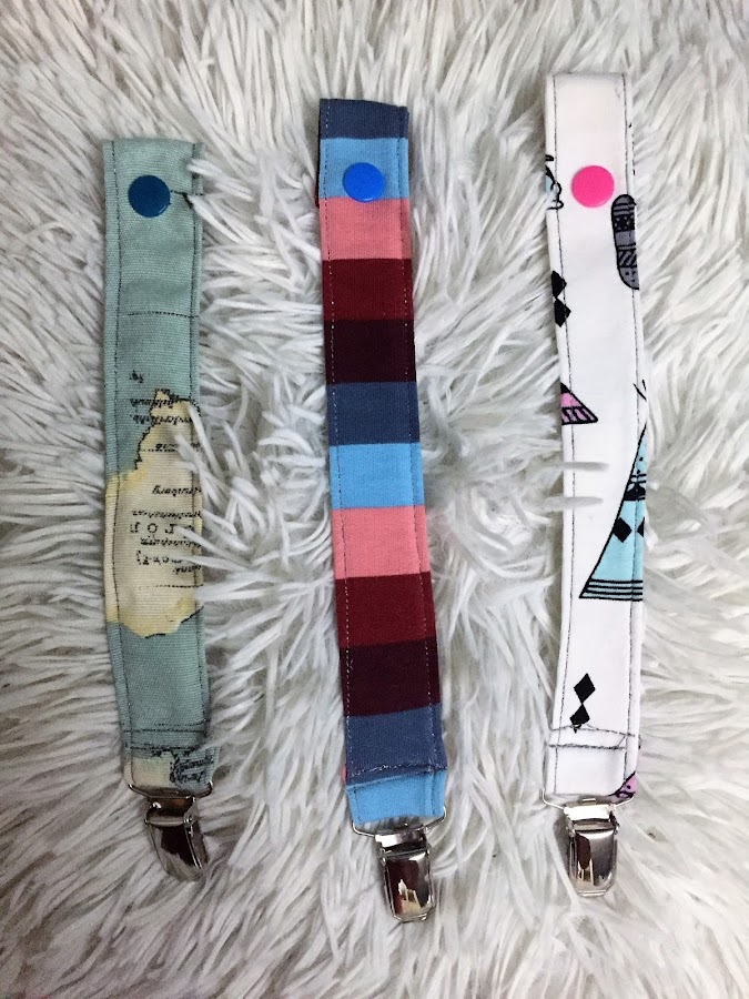 Aquí tenéis los chupeteros que realice, con una tela de mapamundi para Manuel, la tela de tipis para Julieta y la de rayas que aun no desvelo para quien es. Para las costuras elegí un hilo de seoane textil con brillo que me encanta. Como veis es sencillo, unos clip, unos snap y unas tiras de tela y tenemos nuestro chupetero.