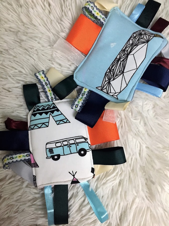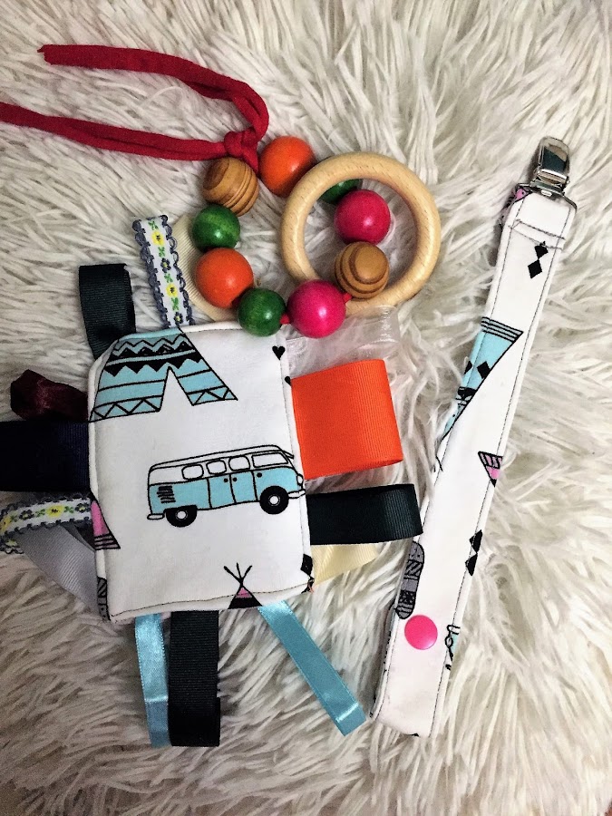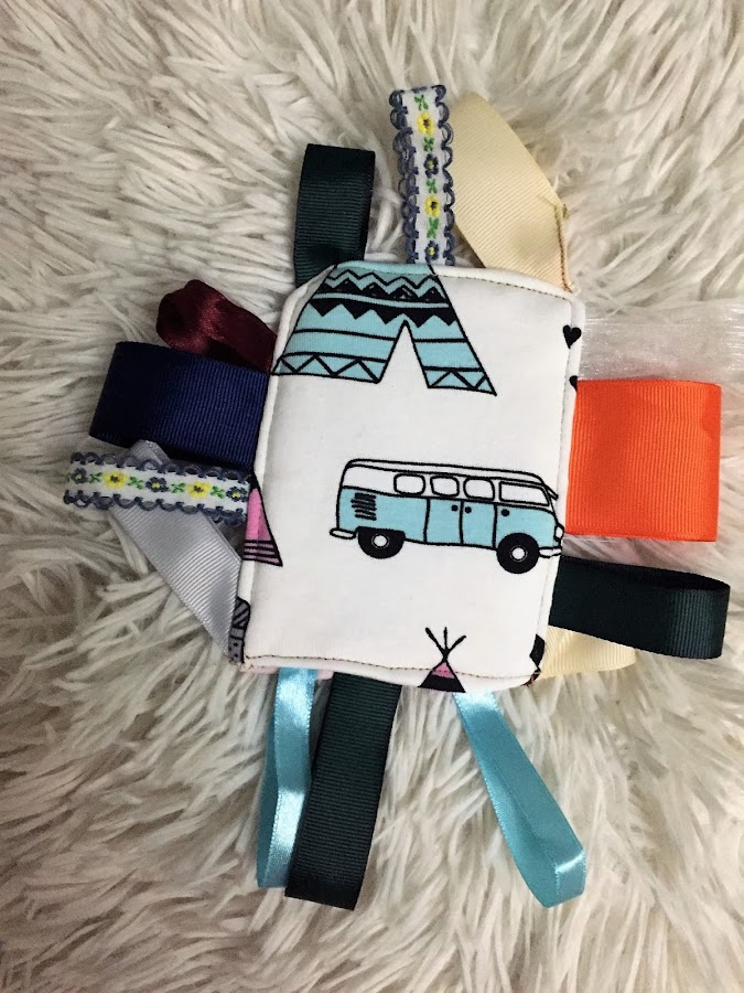 Por ultimo quise hacerles un juguete artesanal que desarrolla totalmente su atención y sus capacidades, es buenisimo para el tacto y la vista. Esta realizado con telas organicas y con colorines, para captar su atención, pero además con un montón de cintas de colores alrededor, que hara que quieran tocarlo, meter sus deditos por las cintas, que son de distintas texturas y grosores, además de coloridas.