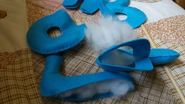 Las coso a punto festón, pero dejando siempre zonas sin coser, come veis aquí, para in metiendo el relleno, me ayudo de un palito de madera, para entrar el relleno en las zonas mas difíciles.