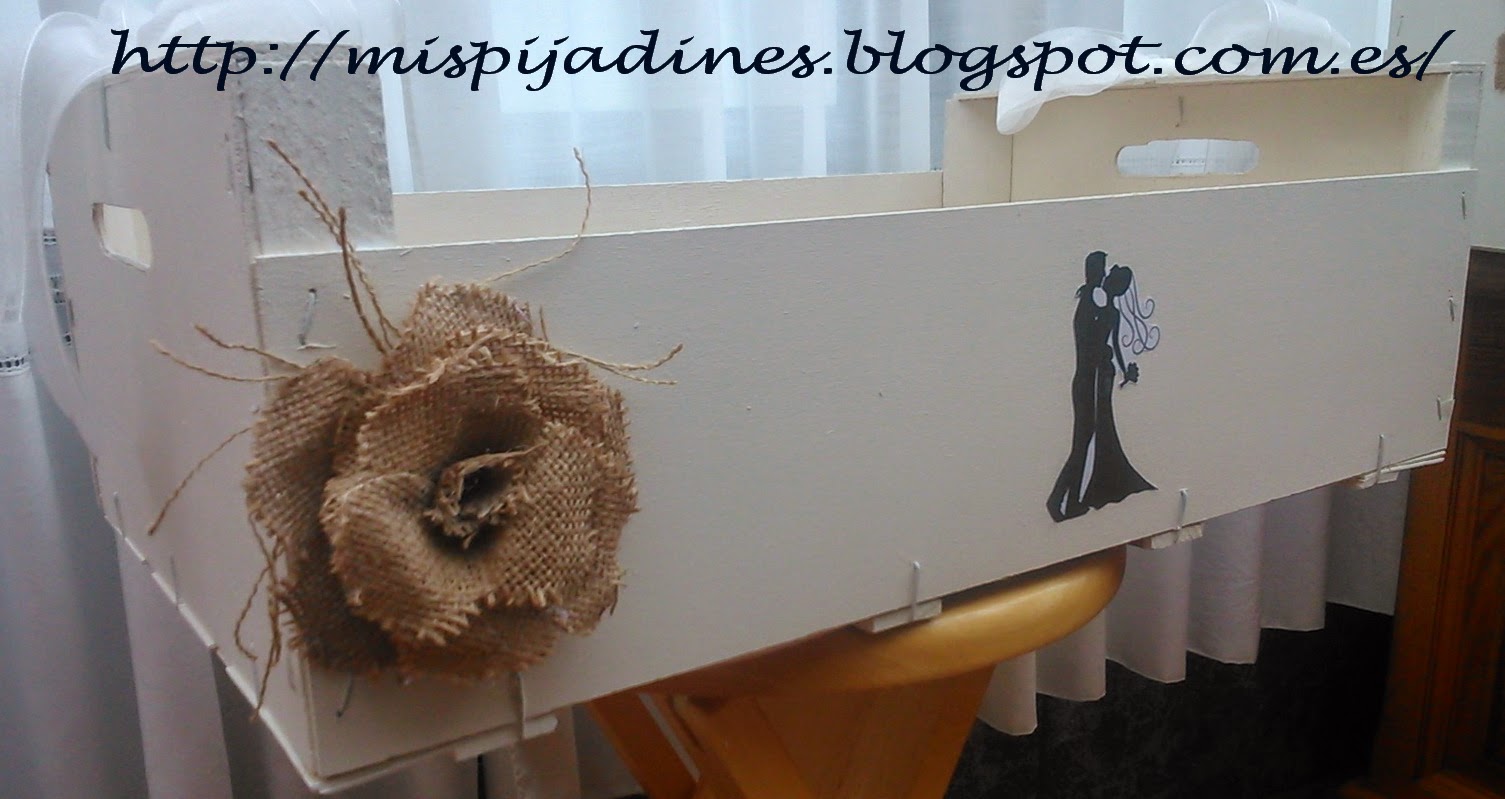 Así que me puse manos a la obra.... utilizamos cajas de fruta siiiiiii ,una idea que me encantó desde el principio; después de dar una buena imprimación todo terreno,las pinte de color blanco roto...unas cuantas manos.... como dos eran para el novio...las adorne con lazos hechos de arpillera....