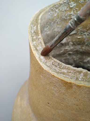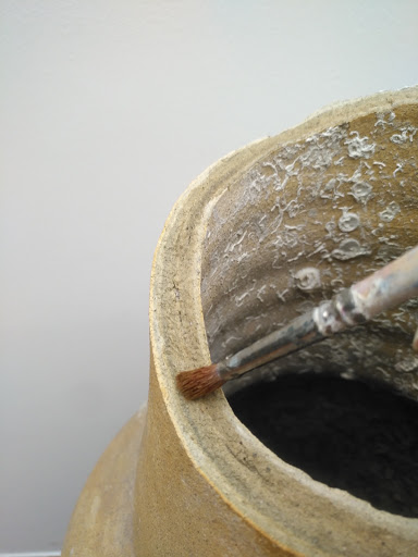 Después de cerrar los poros se prepara el Paraloid para que actúe como adhesivo. Yo lo preparo bastante viscoso, 50% de Paraloid en acetona. Si está demasiado grueso se puede añadir un poco de acetona, ya que el disolvente es bastante volátil. En la fotos abajo podemos ver las dos etapas, la protección en la foto de la izquierda y la aplicación del Paraloid más denso en la foto de la derecha.