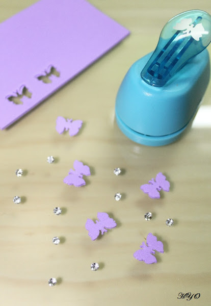 En la copa para chicha me he decantado por pegar varias mariposas de goma eva en color malva y algunas circonitas. Las mariposas las he hecho utilizando un troquelador.