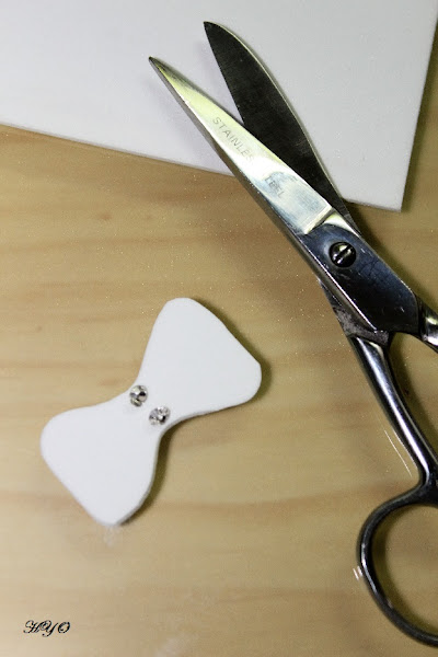 El siguiente paso consiste en decorar las copas que ya tenemos forradas. Es el momento de dejar volar la imaginación y utilizar el material que más os guste: cuentas, puntillas, botones... Para el modelo de chico he cortado una pajarita en goma eva de color blanco, y en su centro he pegado dos circonitas.